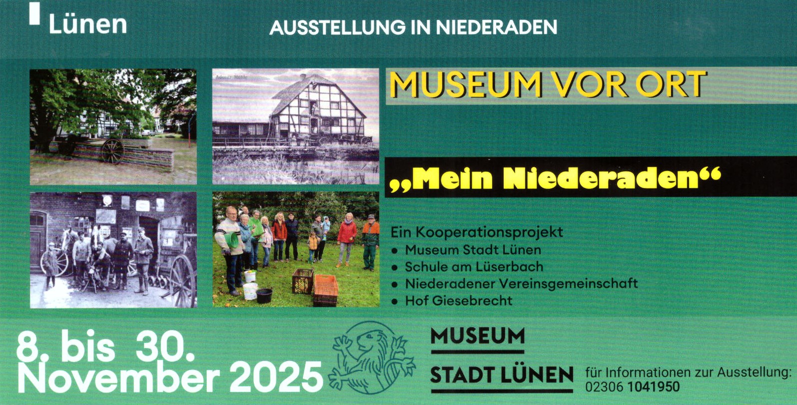 Auf Initiative des Museums der Stadt Lünen und des Stadtverbandes für Heimatpflege Lünen e. V. fand im Ortsteil Lünen-Niederaden im November 2025 die Ausstellung „Museum vor Ort – mein Niederaden“ statt. Die Präsentation sollte den Charakter des Ortsteils und den Zusammenhalt in der dörflichen Gemeinschaft dokumentieren und wurde in einer fast 300 Jahre alten Scheune des früheren „Aenhofes“ (heute Baumschule Giesebrecht) gezeigt. Auf neun Roll-ups stellten geschichtskundige Bürgerinnen und Bürger unterstützt von Vereinen und Unternehmen verschiedene lokale Themen vor, die soziale Zusammenhänge des Dorfes beleuchteten: Es wurden die (zum Teil inzwischen ehemaligen) Gasthäuser des Ortes vorgestellt sowie die Geschichte von fünf großen Höfen und Handwerksbetrieben des Ortes erzählt – und damit Berufe, die heute kaum noch anzutreffen sind. Zum Thema „Wie war das? Schwere Zeiten“ berichteten vier aus dem Ort stammende Bürgerinnen und Bürger (Jahrgang 1944 und älter) als Zeitzeugen über ihre Kindheit im Dorf. Mehrere seit 1989 gemeinsam realisierte Projekte machten sichtbar, wie viel Selbstvertrauen und Gestaltungskraft in der Dorfgemeinschaft steckt. Auch zur Entstehung des 1150 erstmals erwähnten Ortes Niederaden gab es Informationen. Das Projekt „Mein Niederaden“ war Teil der Reihe von Stadtteil-Ausstellungen des Museums der Stadt Lünen, die in lockerer Reihe mit allen Lüner Stadtteilen fortgesetzt wird. Das „Lünen-Fenster“ im Museum bietet Lüner Vereinen und Initiativen Raum für kleine temporäre Ausstellungen.