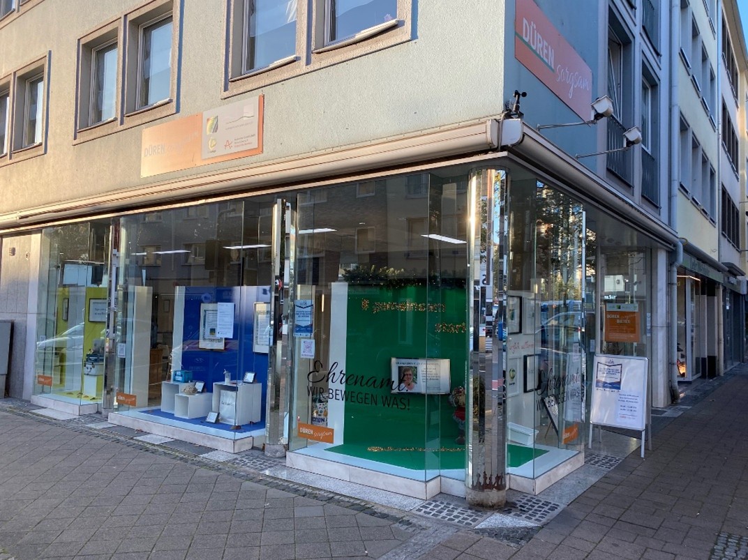 Unter dem Motto „Vier für ein Wir“ haben sich vier Organisationen in Düren zusammengeschlossen, um eine zentrale Anlaufstelle für Menschen in belastenden Lebenslagen zu schaffen – von Alltagssorgen über Demenz bis hin zu Sterben, Tod und Trauer. Seit 2019 betreiben sie ein Ladenlokal in der Innenstadt, das als Koordinierungsstelle fungiert und niedrigschwellige Unterstützung anbietet. Dort sind hilfesuchende Menschen willkommen: Mitarbeitende aus den beteiligten Vereinen beraten, vermitteln und vernetzen mit ambulanten, teilstationären und stationären Einrichtungen. Durch die Bündelung von Kompetenzen und Ressourcen ermöglicht „Düren sorgsam“ eine solidarische Nachbarschaft, in der Menschen Hilfe erhalten können, bevor sie verzweifeln – und Abschied, Trauer oder Krankheit nicht allein durchstehen müssen. Wie erfolgreich und bedeutsam diese Anlaufstelle und die Vernetzung der Trägergruppe sind, zeigt sich auch daran, dass nicht nur Hilfesuchende in ihrer persönlichen Not, Verwandte oder Nachbarn anfragen, sondern sich mitunter auch Ärzte oder Behörden bei der Anlaufstelle melden.